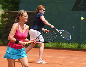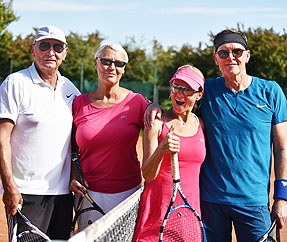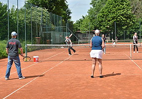 | 19.7.2020 Kennenlern-Turnier Beginn: 13:00 Uhr | Die Vorstandschaft lud zum ersten „Kennenlern“spiel ein, bei dem vorwiegend Mixed und Doppel gespielt wurden. Besonders im Fokus standen die vielen Neuzugänge aus den letzten Jahren. Es ging um Spaß und weniger um sportlichen Ehrgeiz und so war das Turnier für jede Könnensstufe die ideale Möglichkeit, dass sich die langjährigen und eben auch die kurzjährigen Mitglieder besser untereinander kennenlernen konnten. Dies wurde dann in der jeweiligen Doppelauslosung auch besonders berücksichtigt. Man musste sich nicht anmelden, sondern einfach rechtzeitig kommen. Und es kamen ca. 20 Tennisspieler und einige Begleitpersonen. Nach der Begrüßung durch die Vorsitzende Sabine Stegelmann schickte Breitensportwartin Angelika Luichtl die ausgelosten Teams jeweils für eine halbe Stunde auf die Plätze. Die Gewinner bekamen von den Verlierern ein Schleifchen überreicht und dann wurde neu eingeteilt. Nach drei Spielrunden in wechselnden Konstellationen war es Zeit für Kaffee und Kuchen. Es wurde auf der Terrasse bei herrlichem Wetter serviert und die meisten langten kräftig zu. Danach wurde nur noch eine Spielrunde gewertet und auf Basis der vorzeigbaren Schleifchen die Sieger ermittelt. Acht Schleifchen konnte Wolfgang Kuhnert vorweisen und durfte sich als Erster einen der Preise aussuchen, gefolgt von Hans Schulz mit sieben Schleifchen. Alle Vereinsmitglieder waren froh, dass wieder ein Stück Normalität in das Clubleben eingezogen ist – trotz der einzuhaltenden Abstands- und Hygienemaßnahmen. | ![]() ![]() |