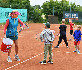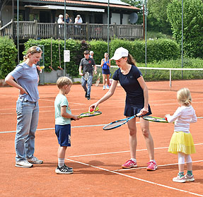 | 29.4.2022 Tennisschnuppern beim Tag der offenen Tür | Kinder und Erwachsene haben heute die Möglichkeit, in den Tennissport und in den Tennisverein "reinzuschnuppern". Sportwartin Eva hat sich zusammen mit ihrem Team einiges einfallen lassen. Und wir haben professionelle Unterstützung: Miriam Liebig vom Bayerischen Tennisverband wird persönlich zur Unterstützung und zur Beratung anwesend sein. Die Eltern sind herzlich eingeladen, sich über unsere Ballschule für die Kinder und das Tennisspielen beim TC Merching zu informieren und auch selbst mal den Schläger in die Hand zu nehmen. Dabei ist es egal, ob schon Tenniserfahrung vorhanden ist oder nicht. Jeder ist willkommen beim Tag der offenen Tür! Ab 17:00 Uhr findet dann ein "Tennis-Schnuppern" für Erwachsene statt, die bei unserem "Express-Tennis" in 10 Trainingsstunden das Tennisspiel so weit erlernen können, dass sie danach mit ihren Trainingspartnern nach den geltenden Regeln mit viel Spaß ein Tennismatch spielen können. Angemeldete Teilnehmer am Express-Tennis müssen übrigens nicht Mitglieder im Tennisclub Merching sein. Tennisausrüstung für Neulinge ist vorhanden. Die Aktion wurde sehr gut angenommen. Am Nachmittag tummelten sich mehr als ein Dutzend Kinder auf den Plätzen, die von Miriam Liebig mit Sachkenntnis und pädagogischem Gefühl in die Eigenheiten der unterschiedlichen Bälle durch Werfen, Fangen, Rollen, Prellen usw. eingeführt wurden. Im Vordergrund stand natürlich der Spaß – und davon hatten Kinder und Betreuer offenbar ganz viel. Abends dann fanden sich acht Erwachsene zum Express-Tennis ein. Sie sollen durch neuartige Lernmethoden in wenigen Stunden in die Lage versetzt werden, mit anderen Spielern ein Match zu spielen und dabei viel Spaß zu haben. Auch hier war viel Begeisterung und Einsatzwille bei den Teilnehmern zu beobachten – und die meisten wollen nach dem Express-Tennis weitermachen. ![]() | ![]() ![]() ![]() |