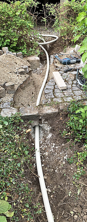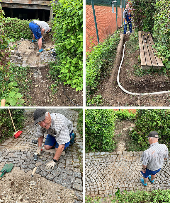 | 23. August 2025 Verlegung der Stromleitungen | Nach langer Suche wurden einige gebrochene Schwachstromleitungen als Gründe für die nicht mehr voll funktionierende Bewässerung der Plätze 1 und 2 identifiziert. Hilft nix – die Leitungen müssen erneuert werden. Am besten durch ein flexibles Rohr, in das vielleicht auch später noch Leitungen eingezogen werden können. Dummerweise führt die Leitung vom Eingang Platz 1 unter der nebenan gelegenen Sitzbankfläche und unter dem gepflasterten Weg vor dem Clubheim hindurch zum Anbau mit der Steuerung. Der größte Teil des Weges ist mit dichtem Bodengewächs verwuchert und der gepflasterte Weg mit massiven betonierten Granitecksteinen befestigt. Richie hatte schweres Werkzeug dabei und Tobias und Sigi mühten sich mit Pickel und Schaufel ab. Nach fast drei Stunden konnte endlich das Rohr mit den Kabeln verlegt und verbuddelt werden. Eine besondere Herausforderung stellten die Pflastersteine dar, die wie ein Puzzle immer wieder ausgetauscht werden mussten, damit die bisherigen Strukturen einigermaßen hergestellt werden konnten. Aber Richie schaffte es mit viel Akribie und Ausdauer. Jetzt müssen noch die elektrischen Anschlüsse realisiert werden und dann hoffen wir, dass alles wieder funktioniert und die vorderen Plätze per Knopfdruck bewässert werden können. Ein herzliches Dankeschön den drei Akteuren.![]() | ![]() |