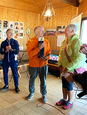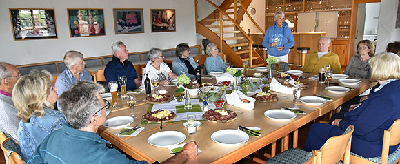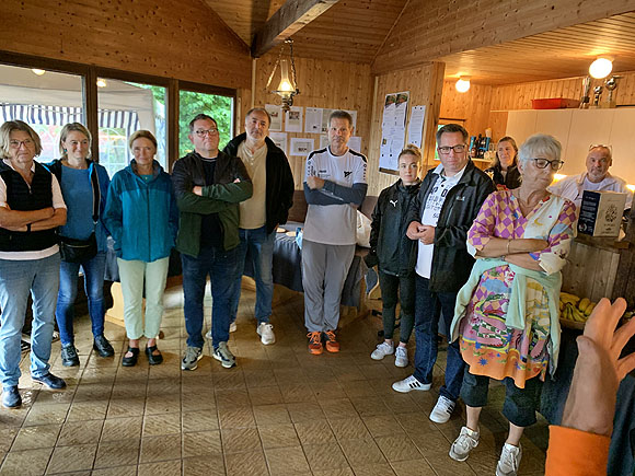 | 8.10.2022 Plauderabend | Es es wurden Wünsche nach einem weiterem Plauderabend geäußert. Dem kommen wir gerne entgegen. Als Termin ist der Abend nach dem Herbstturnier vorgesehen, Beginn um 18 Uhr. Für eine Zusammenlegung der Termine spricht auch die derzeitige Energiesituation, denn die Veranstaltung wird dieses Mal im (geheizten) Clubheim stattfinden müssen. Etwa zwanzig "Plauderfans" fanden sich im Clubheim ein und legten gleich so richtig los, bis man sie an die dieses Mal kreuzförmig angeordneten und herbstlich dekorierten Tische bat, wo Teller rundgereicht wurden mit Südtiroler Speck, Landjägern, Käse und diversen Beilagen. Dazu gab es verschiedene leckere Brotarten, die laut Richie nur aus der örtlichen Bäckerei Storch stammen durften. Das mundete allen offenbar hervorragend, denn in kurzer Zeit waren die Platten leer und die Grundlage geschaffen für den angebotenen Roséwein, aber auch für Bier und nichtalkoholische Getränke. Die Vorsitzende Sabine hatte es sich nicht nehmen lassen, für alle eine leckere selbstgemachte Apfel-Nachspeise zu präsentieren. Dann wurde ein bisschen umgeräumt und vier Teams für den angekündigten Quiz gebildet. Dann präsentierte Sigi B. mit seinen Enkelinnen Lena und Emma eine Quizshow in drei Teilen – Fragen zum TCM, Fragen über Tennis allgemein und Fragen über viele andere Wissensgebiete: Verkehr, Biologie, Filme, Mythologie, Physik, Musik und Werbung. Manchmal konnten sich die Teilnehmer schnell entscheiden, insbesondere bei Auswahlfragen, wo nur ein Schild mit a), b) oder c) hochgehalten werden musste. Bei Schätzfragen dagegen wurde oft länger beraten, bis etwas auf die vorbereiteten Zettel geschrieben und von Emma eingesammelt wurde. Lena verkündete dann die von den Gruppen abgegebenen Antworten. Manchmal lagen sie genau richtig, was einen gehörigen Jubel des entsprechenden Teams zur Folge hatte, und manche Anwort lag ziemlich weit daneben. Aber alle hatten offenbar einen riesigen Spaß. Am Ende verkündete Lena die Sieger: Team 2 mit Rosina, Simone, Walter und Werner. Sie bekamen einen Pokal mit Süßigkeiten und je ein Glas Champagner überreicht. ![]() ![]() | ![]() |