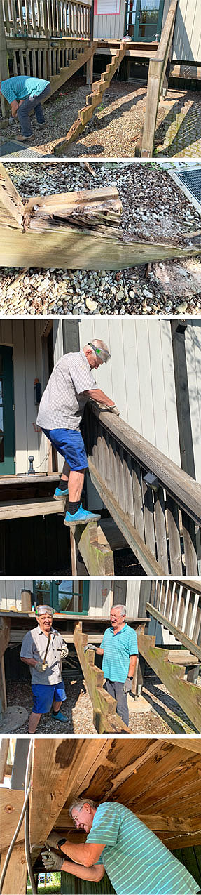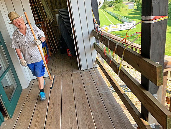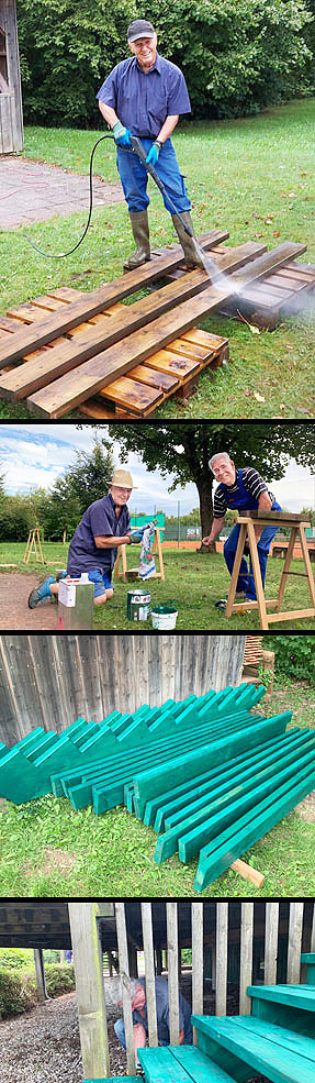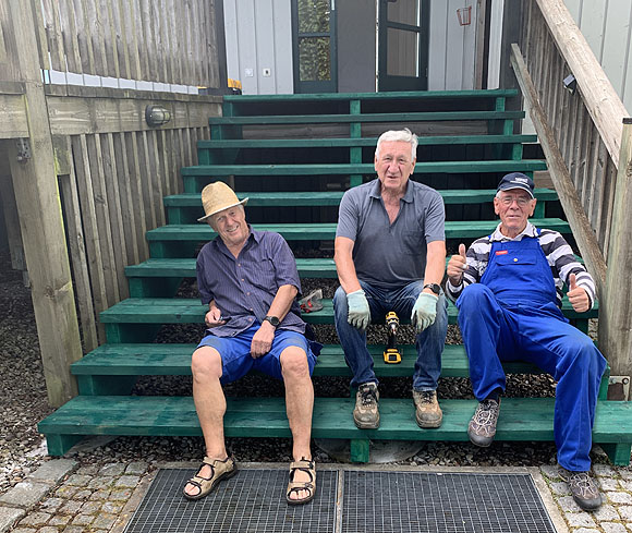 | August 2025 Renovierung der Haupttreppe | Ein paar Oldies nahmen sich dankenswerter Weise der Renovierung der gesperrten Haupttreppe an. Das Projekt wurde arbeitstechnisch und zeitlich geplant, aber – wie fast immer – kamen einige Dinge hinzu, die halt mal passieren. Zunächst musste die morsche Treppe abgebaut werden (wie bereits berichtet), dann wurden die drei Schrägbalken zum Schreiner transportiert, der sie aus einem Stück neu fertigte. Auf seinen Rat hin wurden die Balken sowie die Trittauflagen Hochdruck-gereinigt und mit Schutzfarbe gestrichen. Eine Überraschung war die gelieferte intensive Farbe, die auch nach dem Verdünnen immer noch ins Auge stach. Man setzte dann halt auf die Witterungseinflüsse, die zum Ausbleichen führen werden (bitte besser keine Kritik üben). Die Holzflächen rundherum und der Zeitaufwand für das Aufbringen der Farbe wurde allerdings etwas unterschätzt. Im letzten Schritt musste die Treppe wieder aufgebaut werden. Das lief eigentlich ganz gut, aber am Ende war eine Bohlenkombination zu kurz. Endlich fand man die Ursache – weiter oben gab es eine Vertauschung, die sich bis nach unten durchzog. Also nochmal alles abgebaut und neu angeordnet. Da musste das Mittagessen schon mal bis 16 Uhr verschoben werden. Endlich, nach vielen Stunden ungewohnter Arbeit, konnten sich die Oldies (durchaus mit Stolz) auf ihr Werk niederlassen – nicht ohne sich gegenseitig für den immensen Einsatz zum Wohle des Vereins zu bedanken.![]() | ![]() |