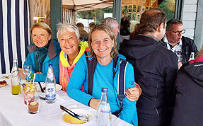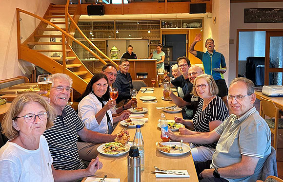 | 3. August 2025 Südtiroler Abend im Clubheim | Nach dem Sommerturnier haben wir ein paar Stunden Zeit zur Erholung (und zum "Aufbrezeln") und ab ca. 17 Uhr setzen wir uns dann dann zum Südtiroler Abend zusammen. Da können natürlich auch Mitglieder teilnehmen, die tagsüber nicht beim Tennisturnier dabei waren. Aber bitte meldet euch bei Ingrid über Telefon oder WhatsApp an, damit uns Speck und Käse nicht ausgehen oder nicht zu viel eingekauft wird. Wenn das Wetter mitspielt, freuen wir uns auf einen angenehmen Sommerabend auf der Terrasse, ansonsten halt im Clubheim. Pünktlich um 17 Uhr fanden sich die Tennisspieler vom Nachmittag und einige Nicht-Spieler im Clubheim ein, wo großer Tisch für die 15 angemeldeten Teilnehmer gedeckt war. Große Wurst-Käseplatten, verschiedene Brotsorten, Salate und allerlei andere Zutaten lagen in Reichweite der Gäste bereit. Sabine begrüßte die Gäste und gab das Büfett frei. Es schmeckte ausgezeichnet, aber der Caterer hatte die Mengen pro Teilnehmer sehr hoch kalkuliert und der anfänglich vom Heißhunger gesteuerte Zugriff wurde bedächtiger. Dann kamen aber erst noch die frisch zubereiteten Schlutzkrapfen auf den Tisch, was manchen älteren Gast fast überforderte. Der Stimmung aber tat dies keinen Abbruch. Manche Gespräche konnten dank der fast quadratischen Tafelanordnung von allen 15 Personen gemeinsam geführt werden. Später ging man über zu Einzelgesprächen – je nach Interessenslage. An einer Ecke hörte man immer wieder das Wort "Holztreppe" und "Bearbeitungsteam", aber Konkretes blieb geheim und so sind alle gespannt, was sich daraus ergibt. Schließlich ist unsere Haupttreppe derzeit gesperrt, weil die Bohlen morsch und rutschig sind. Hier sind Reparaturarbeiten nötig. Vielleicht entwickelt sich etwas diesbezügliches aus den mysteriösen Gesprächen. Nachdem mehrfach die Sitzplätze gewechselt worden waren, um mit verschiedenen Gästen zu sprechen, brachen die ersten Gäste auf und gegen 22 Uhr waren nur noch einige "gute Geister" zugegen, die das Clubheim aufräumten und die Spülmaschinen bestückten. Danke an alle, die sich für diesen Abend engagiert haben. ![]() | ![]() |