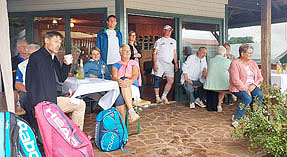 | 2.10.2021 Abschlussturnier | Zum Abschluss-Turnier waren wieder alle Hobby- und Punktspieler eingeladen. Aus den Teilnehmern wurden bei jeder Runde neue Mixed-Paarungen zusammengelost, die dann drei gewertete Runden auf Zeit spielten. Der Verlierer musste eines seiner Schleifchen an den Gewinner abgeben. Klar, dass nach zwei Spielrunden eine Pause eingeschoben wurde, in der von einem (oder mehreren) der drei spendierten Kuchen probiert werden konnte, und auch dampfender Kaffee stand bereit. Man ließ sich Zeit, aber endlich startete man in die dritte und letzte Runde. Danach war nur noch Wunschtennis außerhalb der Wertung angesagt. Die letzten gingen erst gegen 17 Uhr vom Platz, aber sie mussten sich ja noch etwas "stylen", um beim Abendessen, das gegen 18 Uhr angesetzt war, eine gute Figur zu machen. Das war am Ende alles ein bisschen hektisch und man verzichtete aus Zeitgründen auf die Siegerehrung, war besonders von Richie bedauert wurde, hatte der doch endlich einmal alles gewonnen und sechs Schleifchen gesammelt. Dies war zwar vorerst das letzte Turnier der Saison, aber der Spielbetrieb läuft natürlich noch weiter - sofern Wetter und Pandemie dies zulassen. ![]() | ![]() |