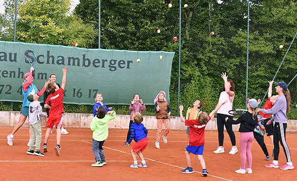 | 1. August 2025 Merchinger Ferienprogramm beim TC Merching | Heute sind die Kinder des Merchinger Ferienprogramms bei uns zu Gast. Dort soll bei dem einem oder anderen Gast die Begeisterung für unseren Sport geweckt werden. Ab 10 Uhr wird je nach Vorkenntnissen der Gäste ein bisschen Ballschule oder auch schon Tennis ohne und mit Schläger geübt. Abschließend soll ein kleines Turnier veranstaltet werden, um ein bisschen Spannung ins Spiel zu bekommen. Eva hat sich einiges einfallen lassen und Lena hilft bei Betreuung und Training mit. 12 Kinder, meist in Begleitung ihrer Mütter oder Eltern, trafen sich mit Eva und Lena auf Platz 3 und 4 zum Schnuppern. Vor allem die Jungs konnten es kaum erwarten, mit den Schlägern auf die Bälle zu dreschen, aber zunächst wurden die Kinder gemäß Größe und Vorkenntnissen in Gruppen eingeteilt, wo sie erst mal einige Ballschulen-Übungen durchführten. Als dann die Tennisschläger zum Einsatz kamen, waren alle mit Feuereifer dabei. Die Jungs übten mit Eva und Lena übernahm die Mädchen, eine weitere Gruppe wurden von engagierten Müttern betreut. Wie meist waren die Jungs nicht so leicht in Griff zu bekommen und viele Bälle flogen statt ins gegenüberliegend Feld über den Zaun. Als Eva aber gleich eine Übung daraus machte, wer am meisten Bälle über den Zaun spielen konnte, da war die Begeisterung groß. Eva war recht angetan von einigen recht talentierten Kindern, die mit dem Ball schon gut umgehen konnten und sich gleich richtig zum Ball stellten. Als am Ende einige Kinder von ihren Eltern zum weiterführenden Training angemeldet wurden, stellte Eva zufrieden fest, dass sich die Zeit für Vorbereitung und Durchführung des Schnuppertrainings im Rahmen des Merchinger Ferienprogramms auf jeden Fall gelohnt hat. ![]() | ![]() ![]() ![]() |