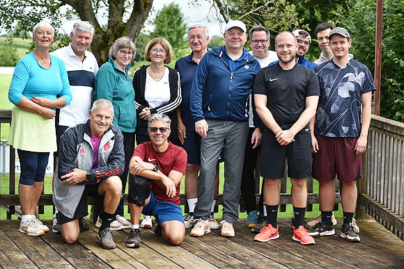 | 3.9.2022 Freundschaftsturnier mit den Meringern auf unserer Anlage | Nach guter alter Tradition findet nach der Corona-Pause wieder das Freundschaftstreffen mit den Meringer Tennislern statt. Es beginnt um 14:00 Uhr. Wer dabei sein möchte, bitte in die aushängende Liste eintragen oder per WhatsApp bei Sabine anmelden. "Ein toller Nachmittag in Merching" – so betitelte Michael Müller vom TC Mering seinen Kurzbericht von unserem Treffen in den TCMering-News. In der Tat hatten die 25 Tennisfreunde aus Mering und Merching großen Spaß am gemeinsamen Spiel und an der nachbarschaftlichen Begegnung. Gleich nachdem Sabine die Gäste begrüßt und Sigi den Turnierverlauf erklärt hatte, gingen die ersten 16 Spieler auf die Plätze: Immer ein Meringer Mann mit einer Meringer Frau, die gegen ein Mixed in umgekehrter Konstellation antraten. Dieser Umstand freute Turnierleiter Sigi B., denn auf diese Weise kam am Schluss ein Unentschieden heraus – und das ganz ohne Aufschreiben und Rechnerei. Das Wetter war anfangs ideal, aber die befragten App-Orakel verkündeten alle das Gleiche: Regen ab 16 Uhr. Und sie irrten nicht. Es tauchten dicke schwarze Wolken auf und bald regnete es in Strömen. Es wurde Plan B aufgerufen, der in vier leckeren Kuchen und mehreren Kannen Kaffee bestand. Es wurde beherzt zugelangt und an den Tischen wichtige Neuigkeiten ausgetauscht. Und fast unbemerkt hatte es wieder aufgehört zu regnen. Mit neuem Elan ging es auf die Plätze, denn schließlich standen zwei wichtige Programmpunkte an, die sich niemand entgehen lassen wollte – Damenwahl und Herrenwahl. Klar, dass es sich mit dem Lieblingspartner und der Lieblingspartnerin noch viel interessanter spielt. Die Veranstaltung war eigentlich bis 17 Uhr geplant, aber besonders einige Gäste wollten noch weitere gewünschte Konstellationen ausspielen. So war es weit nach 18 Uhr, als die letzten von den Plätzen gingen. Manche mussten dann schnell nach Hause, aber andere wollten noch auf einen Drink zusammensitzen. Es war kein Wunder, dass dann plötzlich Hunger aufkam. Da war man richtig froh, dass die Meringer ein Brotzeitbrettl mit Speck und Käse als Gastgeschenk mitgebracht hatten, das nun von dem verbliebenen ausdauernden Dutzend mit viel Genuss und einigen Getränken konsumiert wurde. Erst in der Dämmerung machten sich die letzten Teilnehmer auf den Nachhauseweg. Alle waren sich einig, dass das Treffen allen Spaß gemacht hatte und es auch im nächsten Jahr wieder stattfinden sollte. ![]() ![]() | ![]() ![]() ![]() ![]() ![]() ![]() ![]() |