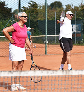 | 8.10.2022 Herbstturnier | Noch mal so richtig das Freilufttennis genießen können die Clubmitglieder bei unserem Herbstturnier, zu dem Teilnehmer aller Könnenstufen eingeladen sind. Es wird vorwiegend Mixed gespielt und wir freuen uns besonders auf die neuen Clubmitglieder. Beginn ist um 14:00 Uhr "Leider spielte das Wetter nicht so richtig mit und bei immer wieder einsetzendem Nieselregen kamen nicht so viele Mitglieder wie erwartet auf die Anlage. Zumindest auf zwei Plätzen aber hatten die Hartgesottenen offenbar viel Spaß. Die Vereinsvorsitzende Sabine meinte sogar, dass es gar nicht so schlimm wäre mit der Nässe und der Kälte - wenn man mal oberflächlich nass wäre und sich gut bewegte. Jedenfalls wurde zwei Stunden lang gespielt und dann freute man sich schon auf das Kuchenbüfett, das Ingrid und Rosina einladend hergerichtet hatten. Da trafen die Spieler dann auf einige Mitglieder, die ausschließlich zu Kaffee und Kuchen gekommen waren. | ![]() |