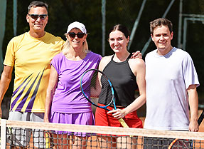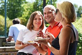 | 4.8.2024 40-jähriges Vereinsjubiläum, Tag 2: Freundschaftsturnier | Auch sportlich sollte das Jubiläum gefeiert werden und so wurden für den Sonntag Gäste aus den befreundeten Tennisvereinen in Mering, Kissing und Walleshausen zu einem Turnier eingeladen, bei dem Mixed-Partner aus den verschiedenen Vereinen immer wieder neu zusammengelost wurden. Jeder Spieler bekam seine gewonnen Punkte gutgeschrieben und am Ende konnten die Sieger geehrt werden. Ganz vorne landeten die Gäste aus Walleshausen mit Melanie Braun bei den Damen und Martin Huber bei den Herren, die gerne ihre Preise in Empfang nahmen, die vom Sponsor Champruss zur Verfügung gestellt wurden. Erschöpft aber glücklich über den gelungenen Verlauf der Feierlichkeiten bei idealem Wetter bedankte sich Sabine anschließend in kleiner Runde bei allen ehrenamtlichen Helfern und fragte begeistert „Na, wie haben wir das hingekriegt?“ ![]() ![]() ![]() ![]() | ![]() ![]() ![]() ![]() ![]() ![]() ![]() |