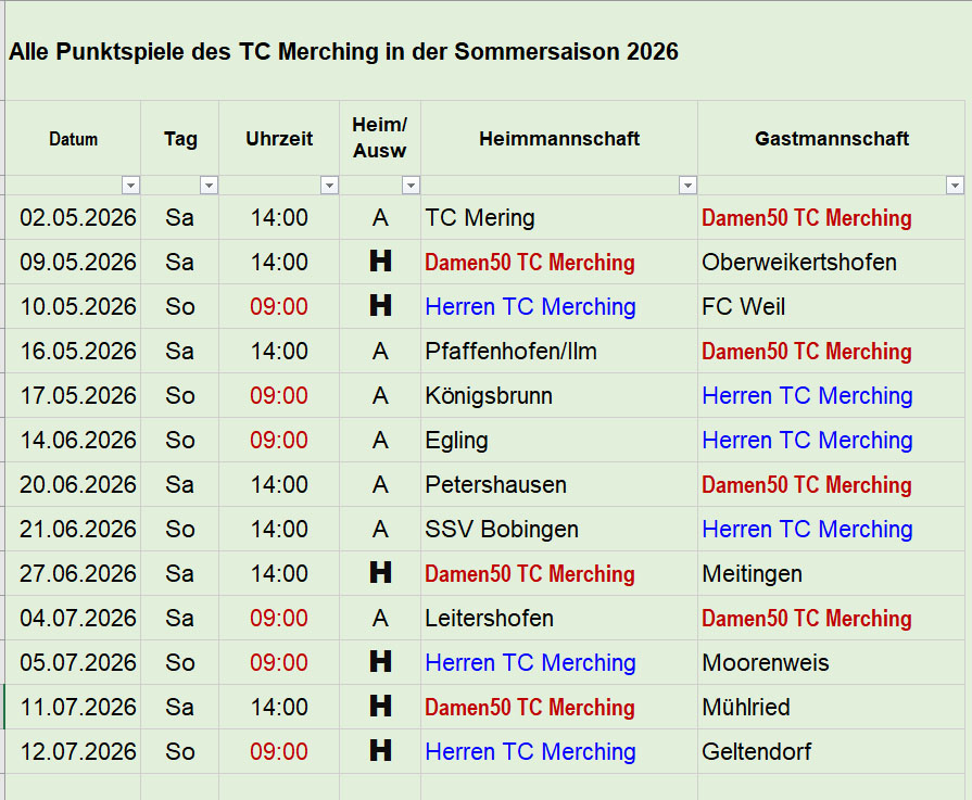 Der Tennisclub Merching bietet seinen Mitgliedern die Möglichkeit, sich in einer Tennismannschaft am Punktspielbetrieb des Bayerischen Tennisverbands zu beteiligen. Sportwartin Eva Wülbern betreut zwei Mannschaften in der Medenrunde: